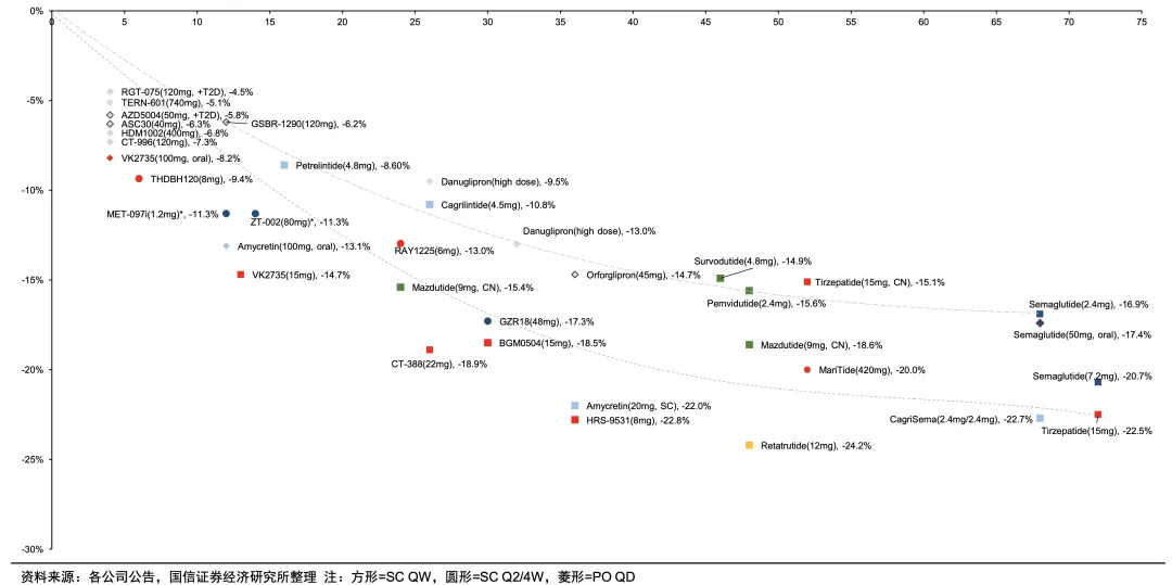 非肽类口服GLP-1的成药性得到验证,Orforglipron III期临床研究ACHIEVE-1达到主要终点,在40周时相较安慰剂显著降低糖化血红蛋白(A1C)水平,平均从基线的8.0%降低1.3%至1.6%;在关键次要终点,超过65%的患者在使用最高剂量Orforglipron后,A1C降至≤6.5%,低于美国糖尿病协会(ADA)定义的糖尿病诊断阈值;在另一关键次要终点,接受最高剂量Orforglipron治疗的患者平均减重7.3kg(7.9%),且患者在研究结束时尚未达到体重减轻平台期,可能表明尚未实现完全减重。礼来也在研究Orforglipron对非糖尿病患者的减重效果。据2023年发布的II期临床试验结果,每日服用Orforglipron 36周后,根据剂量不同平均减重效果能达到9.4%至14.7%。