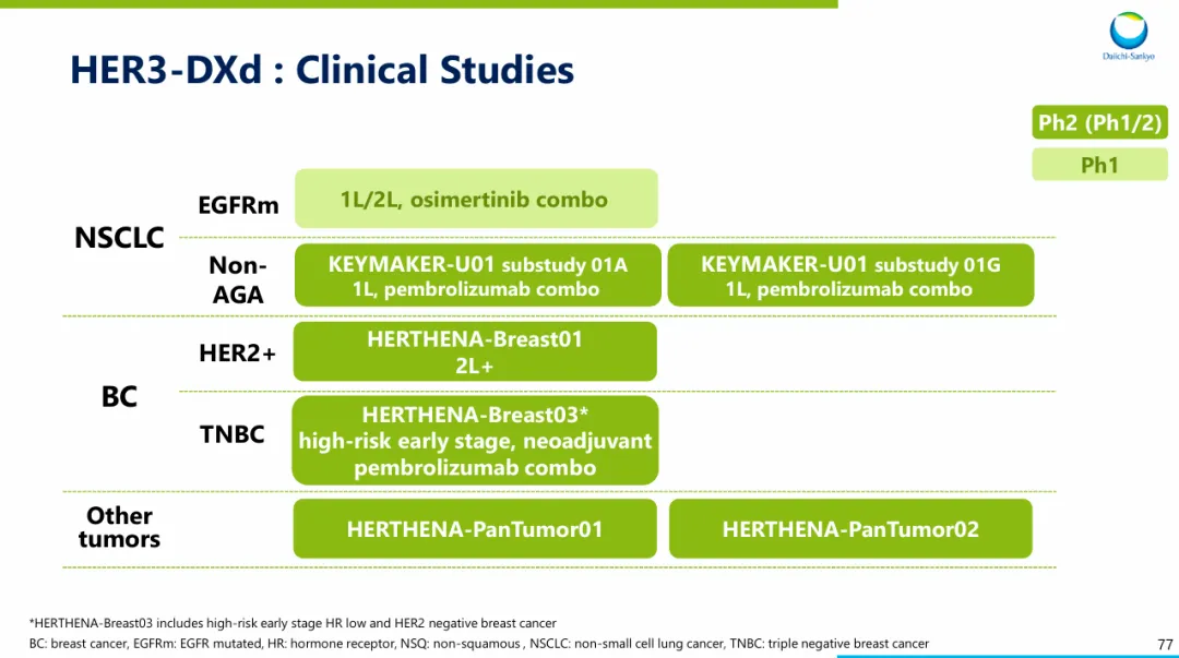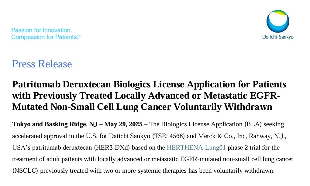 ASCO会议召开前夕,由于验证性三期临床HERTHENA-Lung02没有达到OS终点,默沙东与第一三共宣布自愿撤回HER3 ADC新药Patritumab deruxtecan(HER3-DXd)治疗EGFR突变NSCLC的上市申请,为HER3 ADC药物的开发蒙上阴影。