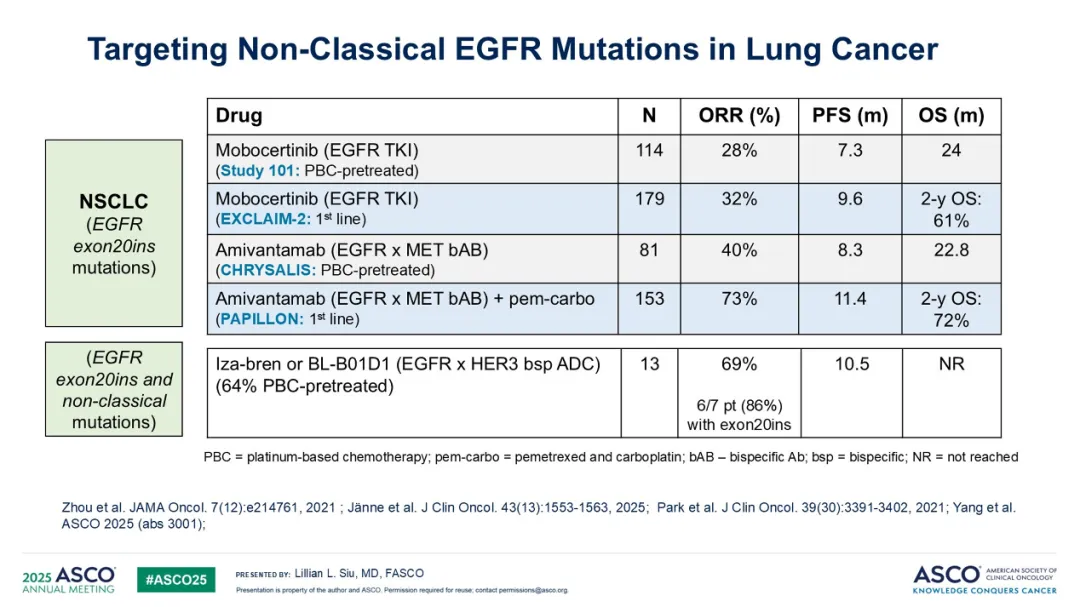 ADC药物EGFR/HER3双抗药物iza-bren(BL-B01D1),此前已经展现过在EGFR突变的非小细胞肺癌治疗的非凡疗效。此次ASCO会议期间,进一步展示了非EGFR经典突变的非小细胞肺癌治疗进展。