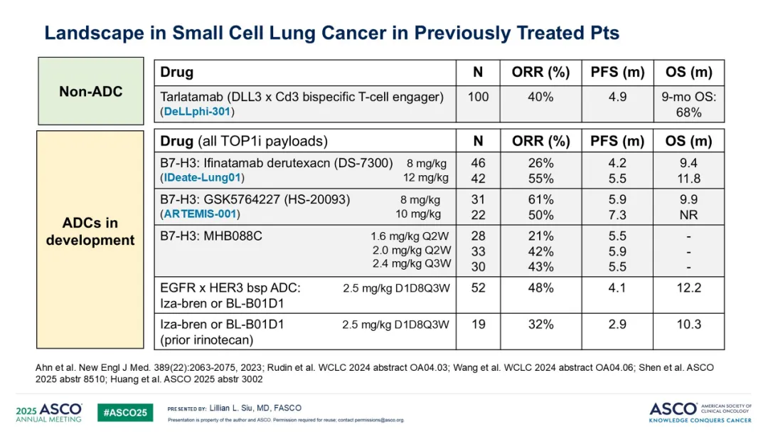 除了非小细胞肺癌,iza-bren(BL-B01D1)本次ASCO会议还带来了小细胞肺癌中的临床进展,总体人群的总缓解率(ORR)为55.2%,确认的ORR为44.8%,中位无进展生存期(PFS)为4.0个月,中位总生存期(OS)为12.0个月,超越了目前ADC药物在小细胞肺癌大部分的生存期数据。
