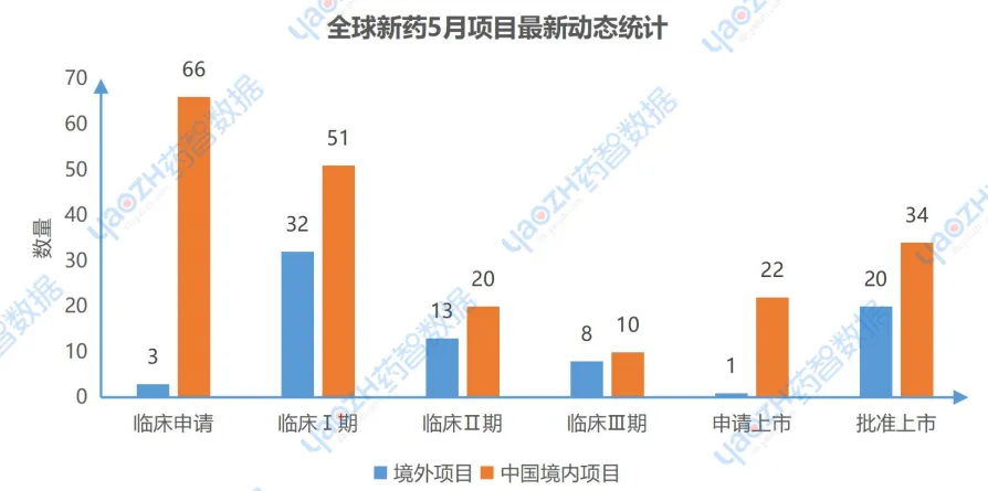 5月共671个药物有相关更新动态,其中有280个项目推进到最新的阶段,其中在中国境内进行的项目共203个,境外项目有77个。