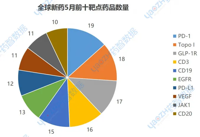 5月有更新动态的671个项目中,涉及最多的靶点是PD-1,其次是Topo I和GLP-1R。以下是排名前十的靶点,图中仅展示药品数量,具体内容可通过全球药物分析系统进行查看。