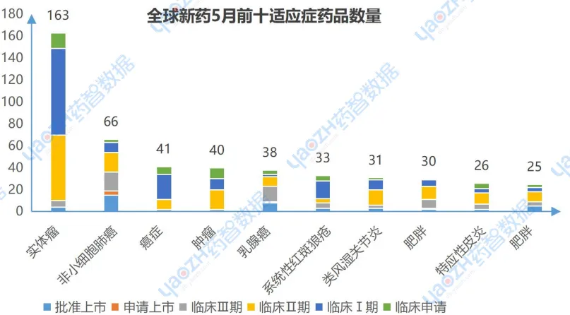 5月有更新动态的671个项目中,涉及最多的适应症是实体瘤,其次是非小细胞肺癌和癌症。以下是排名前十的适应症及其全球最高研发阶段情况,图中仅展示药品数量,具体内容可通过全球药物分析系统进行查看。