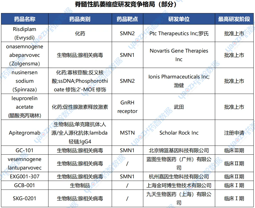 据全球药物分析系统数据库统计,目前已有4款治疗脊髓性肌萎缩症的药品获批上市,但都是海外产品,包括罗氏的risdiplam、诺华的onasemnogene abeparvovec、渤健的nusinersen sodium以及武田的leuprorelin acetate,其中三款已在中国上市。国内企业目前只有锦篮基因的GC-101处于第一梯队,进入临床三期,还有包括蓝图生物、嘉因生物、金珂博生物等也有相关项目进入临床研发阶段。如果临床顺利,GC-101有望成为国产首款治疗脊髓性肌萎缩症的药物,为广大患者带来新选择。