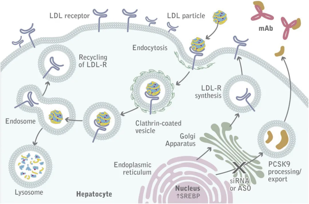 PCSK9全称为Proprotein convertase subtilisin/kexin type 9,是由人类1号染色体上的PCSK9基因编码的一种酶。为什么该种酶会被注意到,因为人们发现了这种酶调控LDL-c的能力,具体做法是与LDL受体(LDLR)结合,从而在细胞内吞时将其运输到溶酶体,并促进细胞内降解以防止其再循环。也就是说,PCSK9这种酶类会促进LDLR的降解,这就会导致血液内游离的LDL-c增多。