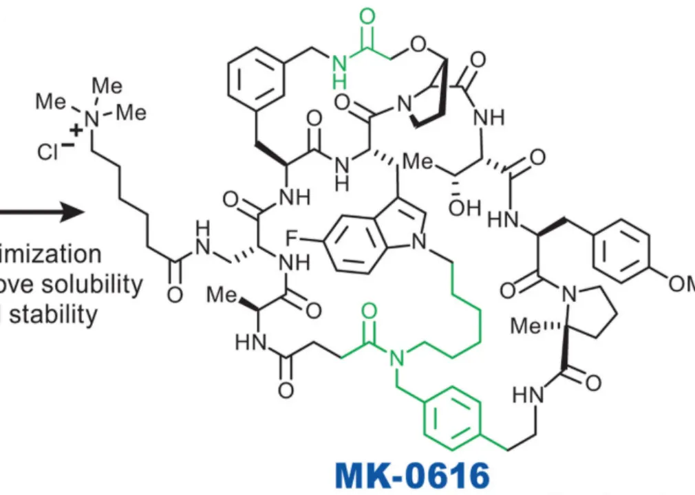 接下来可以一窥究竟,默沙东的压箱底宝物到底什么样了。它的结构如下图所示,是一种大环肽。这里我们推荐一篇早期文献:《Orally Bioavailable Macrocyclic Peptide That Inhibits Binding of PCSK9 to the Low Density Lipoprotein Receptor》。