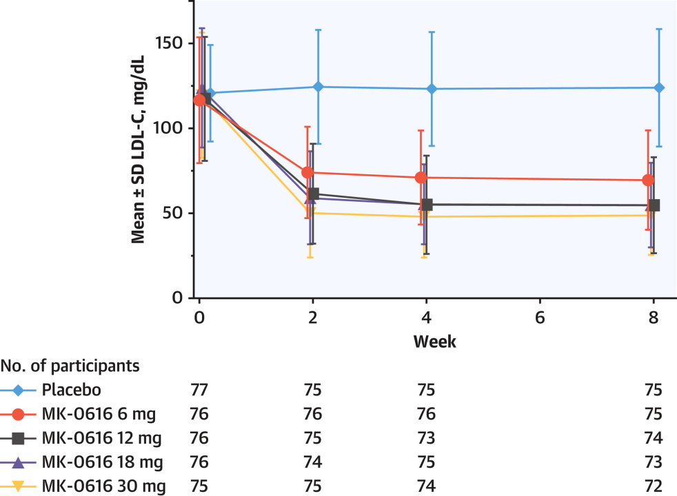 这是临床I期的数据,下面让我们看之后的数据。临床2b期的数据发在了JACC上。这项试验计划纳入375名动脉粥样硬化性心血管疾病风险各异的成年参与者。参与者按1:1:1:1:1的比例随机分配至MK-0616组(6、12、18或30毫克,每日一次)或相应的安慰剂组。为期16周,8周治疗期和8周随访期。