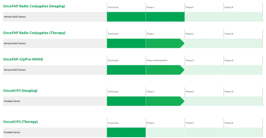 Philochem则是Philogen的子公司,其管线内还涉及到四款核药分别是68Ga-OncoACP3(诊断核药)、177Lu-OncoACP3(治疗核药)、18F-OncoACP3(诊断核药)和225Ac-OncoACP3(治疗核药)。其中225Ac-OncoACP3的I期临床IND正在筹备中。