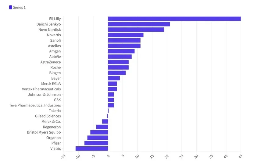 晖致营收下滑11%,辉瑞下降8%,BMS减少6%——这些数字背后是逼近的专利悬崖:强生、罗氏、默沙东等巨头的重磅产品将在2030年前集中专利到期。