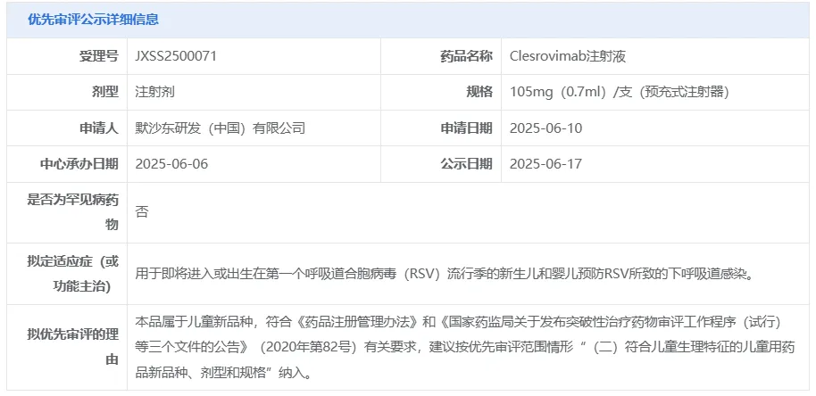6 月 17 日,CDE 官网显示,默沙东的 Clesrovimab (MK-1654) 注射液上市申请拟纳入优先审评,适应症为用于即将进入或出生在第一个呼吸道合胞病毒(RSV)流行季的新生儿和婴儿预防 RSV 所致的下呼吸道感染。
