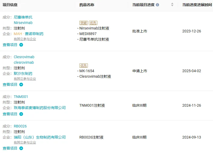 在国内,目前仅有阿斯利康/赛诺菲的尼塞维单抗获批。默沙东的 Clesrovimab 已报上市。此外,还有两款 RSV 单抗已进入 Ⅲ 期临床,分别来自泰诺麦博(TNM001)、瑞阳生物(RB0026)。