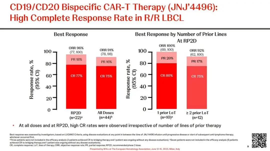 与此同时,作为西比曼全球合作伙伴的强生,也在EHA会议上公布了这款靶向CD19/CD20 CAR-T疗法(在强生的产品代号:JNJ-90014496)治疗R/R LBCL全球Ⅰb期的研究结果:在全部可评估患者中的ORR达90.5%,CRR为76.2%。
