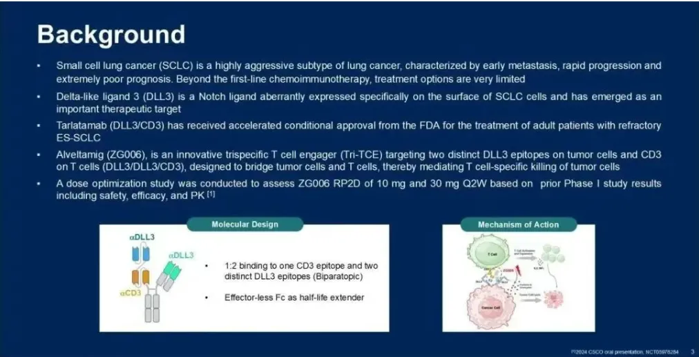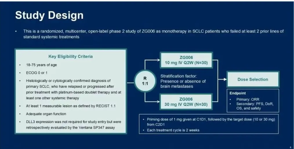 mg。将有60名患者以1:1的比例随机分组接受ZG006治疗。主要终点是根据RECIST1.1评估的客观缓解率(ORR)。研究不强制要求DLL3表达,但会通过免疫组化(IHC)进行回顾性评估。
