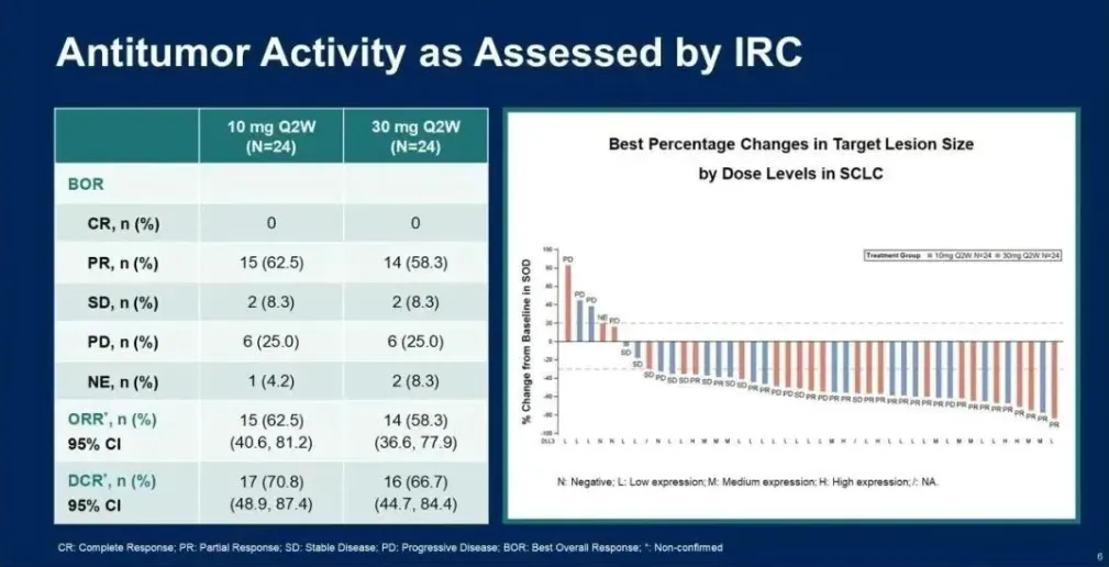 mg组的ORR为78.6%,DCR为100.0%。缓解持续时间(DoR)和无进展生存期(PFS)尚未成熟,将在后续随访中更新。在所有27名患者中,21名(77.8%)患者基线时DLL3表达为低(N=17)或中(N=4),他们表现出相当不错的抗肿瘤疗效,有15例PR,ORR为71.4%。