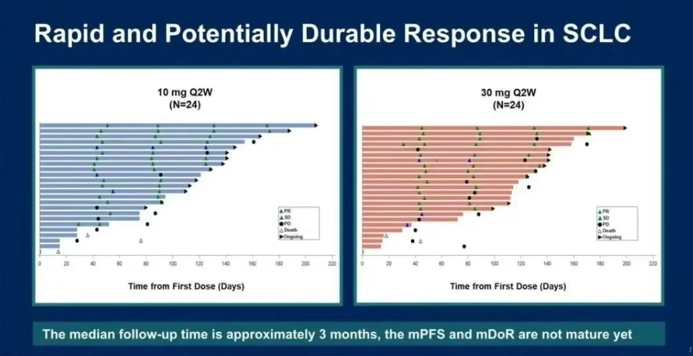 mg组13名,30 mg组14名)至少进行了一次基线后肿瘤扫描的SCLC可评估疗效患者中,18名患者获得了部分缓解(7名在10 mg组,11名在30
