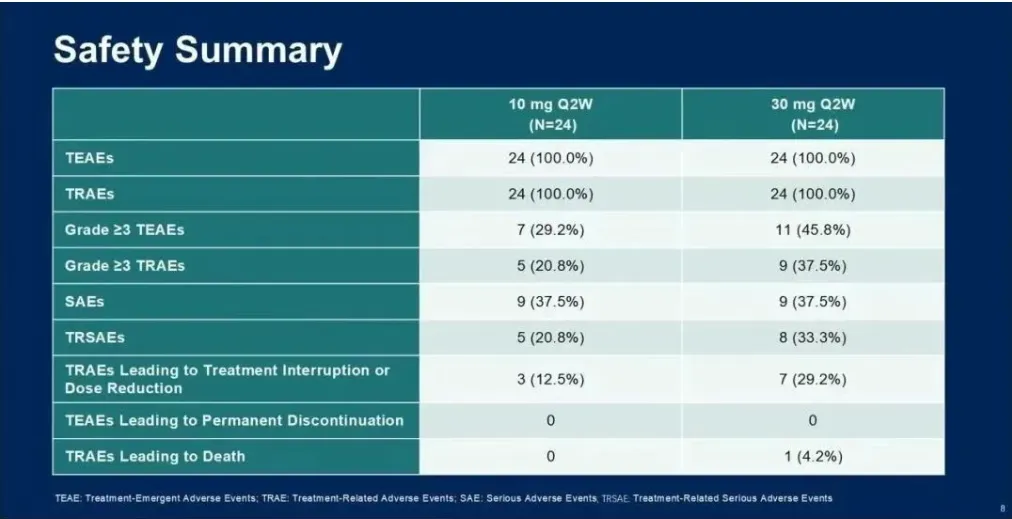 只有5名患者(12.5%)经历了3/4级TRAEs,包括1例3级CRS,并且没有患者因TRAEs导致治疗中断或死亡。5名患者(12.5%)经历了严重TRAEs。在两个剂量组之间未观察到安全性方面的显著差异。