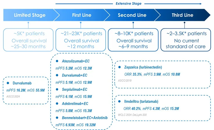 二线治疗方面,此前的拓扑替康仅能让不足30%的患者获益,中位OS仅为8个月作用,同时耐受性差存在较强的血液毒性。近年来批准的lurbinectedin和DLL-3/CD3双抗则将二线治疗的响应率提高到40%,中位生存期提高到10.8~15.2个月。