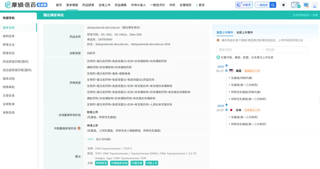 (注:芦康沙妥珠单抗已在中国获批两项适应症:2024 年 11 月 22 日,NMPA正式完全批准芦康沙妥珠单抗用于既往至少接受过 2 种系统治疗(其中至少 1 种治疗针对晚期或转移性阶段)的不可切除的局部晚期或转移性三阴性乳腺癌成人患者;2025 年 3 月 4 日,NMPA 附条件批准其用于治疗经表皮生长因子受体(EGFR)酪氨酸激酶抑制剂(TKI)和含铂化疗治疗后进展的 EGFR 基因突变阳性的局部晚期或转移性非鳞状非小细胞肺癌(NSCLC)成人患者)