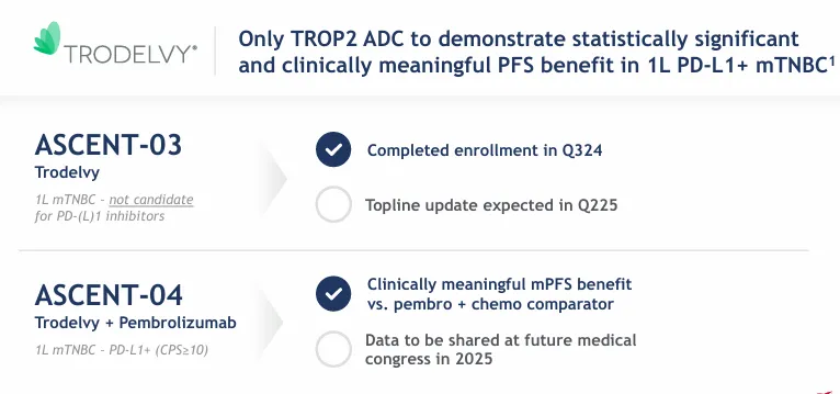 2025年5月23日,吉利德公布了Trodelvy的ASCENT-03试验的初步结果,该研究达到了主要终点,与化疗相比,一线转移性三阴性乳腺癌患者的无进展生存期得到了极具统计学意义和临床意义的改善。(ASCENT-03研究是一项全球性、开放标签、随机3期试验,目的是评估在肿瘤不表达PD-L1或PD-L1阳性且既往接受过PD-(L)1抑制剂治疗的既往未经治疗的局部晚期、无法手术或转移性三阴性乳腺癌患者中,与医生选择的治疗方法相比,Trodelvy的疗效和安全性。)