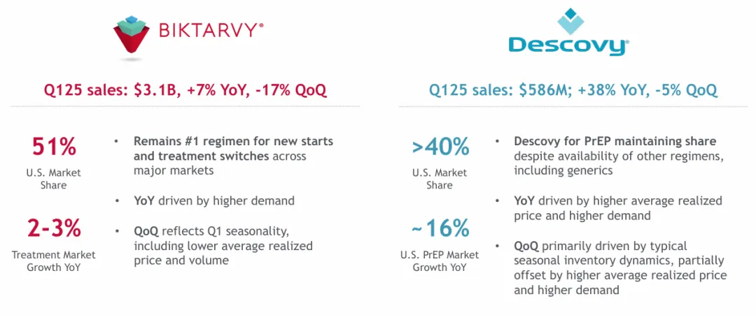 公司在HIV治疗市场占据主导地位,2024年HIV业务收入达196.12亿美元,占总营收的68.2%。核心产品Biktarvy(必妥维)年销售额达134.23亿美元,同比增长14%,占据美国市场份额的50%。另一款药物 Descovy(达可挥)销售额21.13亿美元,同比增长6%,在美国PrEP市场占据超40%份额。2025年第一季度HIV业务收入45.87亿美元,其中Biktarvy销售额31.5亿美元,Descovy销售额5.86亿美元。