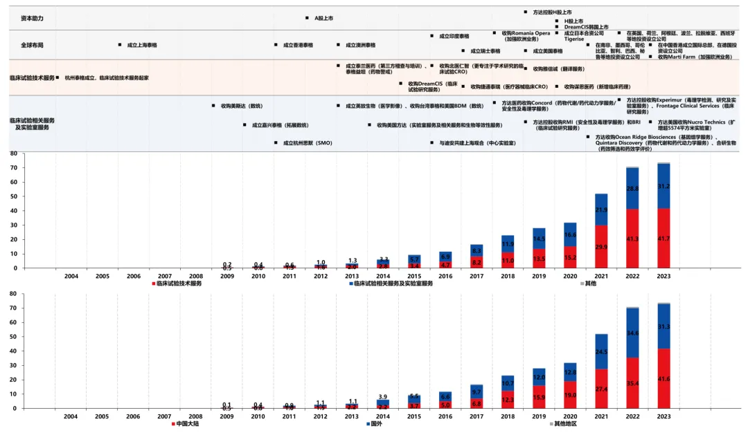 泰格医药是收购方面的鼻祖。从2009年开始陆续并购数统、临床前和区域中心等各类服务商,最终形成全球执行能力。从美斯达、BDM到方达、圣苏,再到东欧、东亚临床网络,路径清晰。2016年以后,它的全球交付基本成熟,国内也稳在第一梯队。