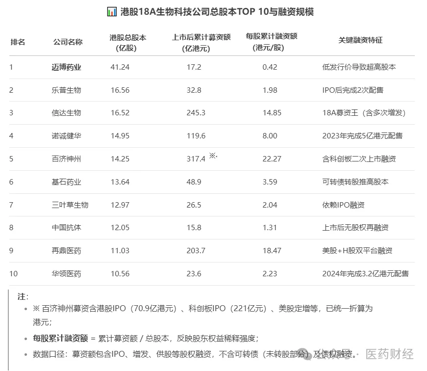 迈博药业(41亿股)股本最大但融资能力最弱(仅17亿港元),每股融资额仅0.42港元,反映其低估值困境;
