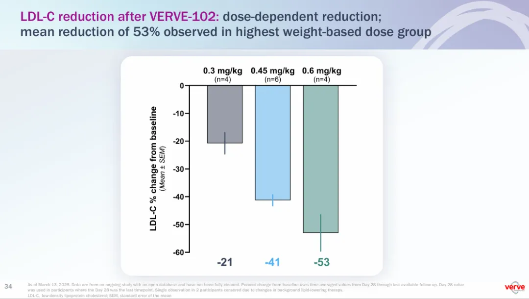 与现有治疗方法相比,VERVE-102的最高剂量队列在数值上甚至优于Novartis的Leqvio,后者在杂合子家族性高胆固醇血症(HeFH)患者中显示出39.7%的LDL-C降低。