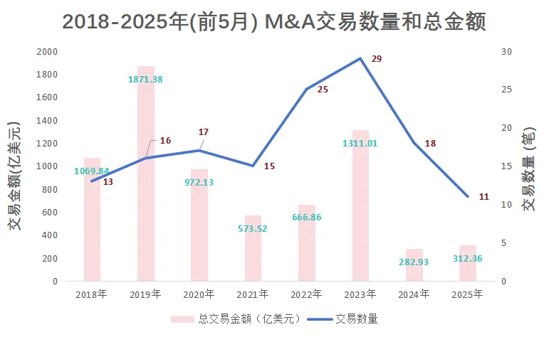 图1. 2018-2025. 06. 02医药行业M&A数量与总金额走势图。(数据来源:Biopharma Dive)