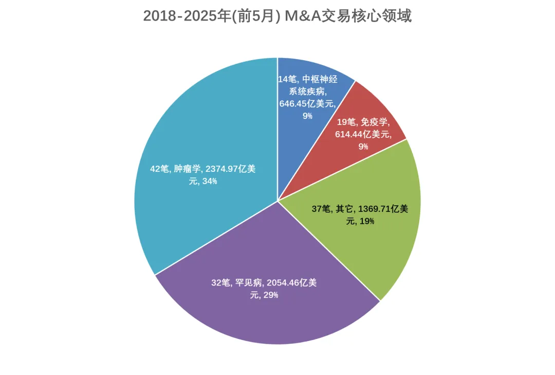 图3. 2018-2025. 06. 02医药行业M&A交易的适应症领域。(数据来源:Biopharma Dive)