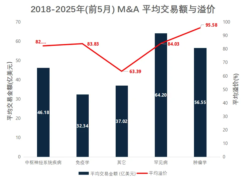 图4. 2018-2025. 06. 02医药行业M&A交易的适应症领域的平均交易金额和平均溢价。(数据来源:Biopharma