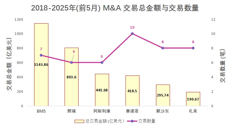 在2018至2025年并购市场中,共有6家企业完成了超过5笔交易,堪称并购领域的高频买家。它们分别是 BMS、辉瑞、阿斯利康、赛诺菲 、默沙东和礼来六大制药巨头,在活跃度上显著领先其他公司,并呈现出各自鲜明的战略特征(图5)。