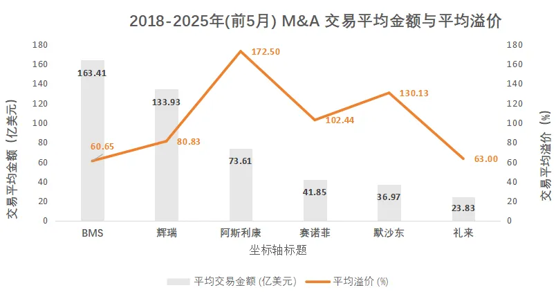 图6. 2018-2025. 06. 02医药行业M&A交易头部买家交易平均金额与溢价。(数据来源:Biopharma Dive)