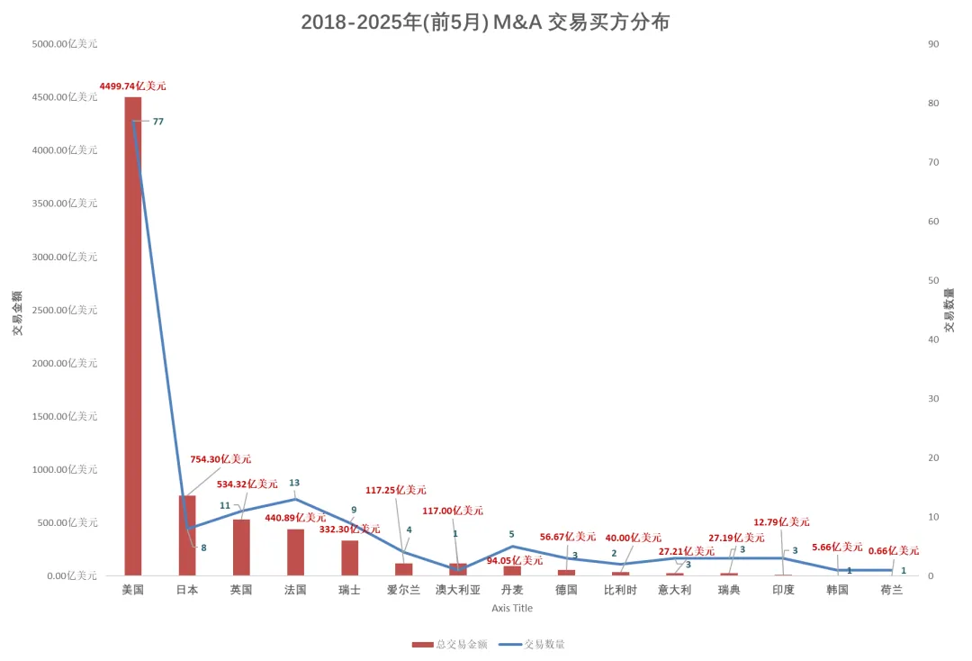 英国以11笔交易和534.32亿美元的交易金额排名第三,表现稳健,得益于如AstraZeneca、GSK和invoX Pharma等企业的海外扩张策略。法国和瑞士则分别以13笔和9笔交易位列前五,显示出欧洲传统医药强国在全球市场整合中的持续存在感。整体来看,交易活动高度集中于少数几个发达国家,反映出生物医药领域资本整合的地域不均衡格局。