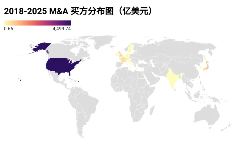 2024年交易总金额骤降至282.93亿美元,即便交易数量仍有18起,显示当年缺乏高额并购案支撑,行业情绪保守,可能受到利率环境、估值回调与宏观不确定性因素的影响。