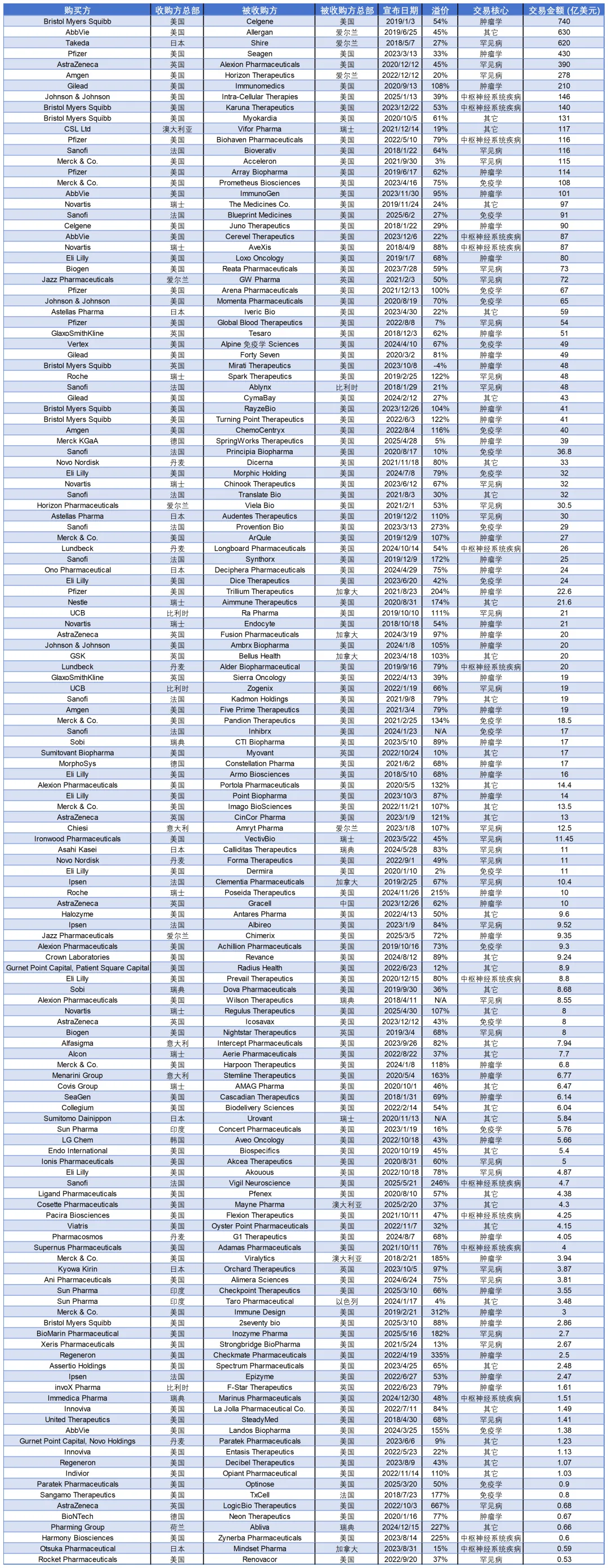 阿斯利康也完成了6笔交易,累计金额为441.68亿美元,虽然单笔体量略低于前两者,但其平均溢价却达到惊人的172.5%。这意味着AZ在资产争夺中竞争更激烈,尤其是在罕见病领域(如收购Alexion)与新兴免疫方向的布局,表现出强烈的攻势姿态。