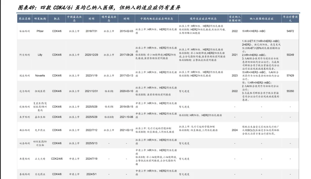 目前,国产CDK4/6抑制剂已获批的适应症都是晚期乳腺癌,竞争力仍弱于外资品种。进医保只是其中一环,未来适应症拓展才是竞争的关键。
