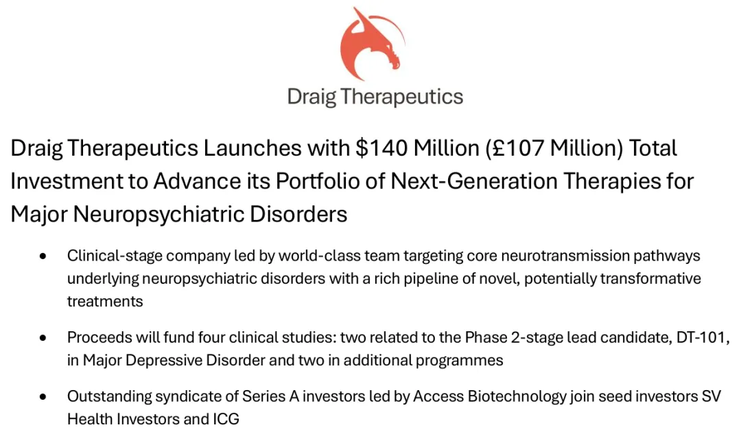 6月18日,英国卡迪夫,Draig Therapeutics是一家旨在改变神经精神疾病治疗的临床阶段公司,宣布走出隐身模式,在过去九个月内共筹集了1.4亿美元(1.07亿英镑)A轮融资。超额认购的A轮融资由Access Biotechnology领投,Canaan Partners、SR One、Sanofi Ventures、Schroders Capital以及共同创立该公司的种子投资者SV Health investors和ICG参与其中。Draig是威尔士语中“龙”的意思,反映了该公司在威尔士的起源。
