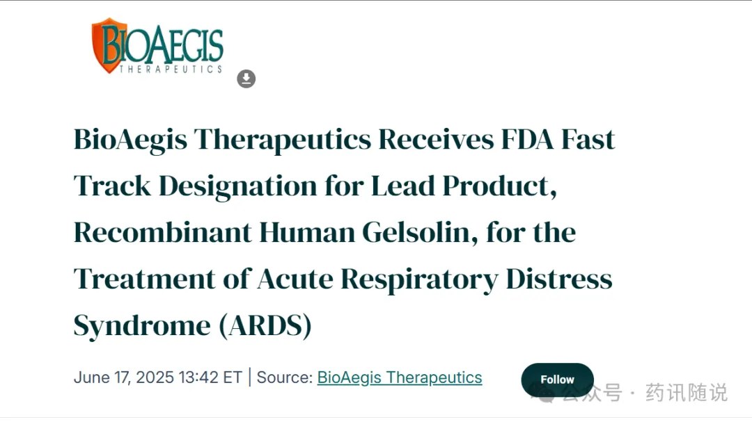 6月17日(当地时间),BioAegis Therapeutic宣布FDA授予其治疗急性呼吸窘迫综合征(ARDS)重组人血浆凝溶胶蛋白(rhu-pGSN)快速通道资格(FTD)。