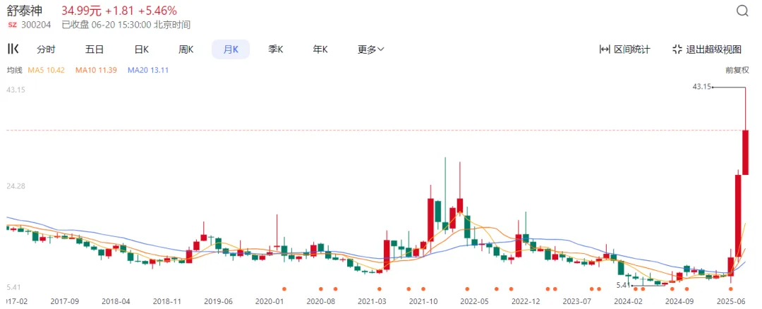 在资本市场的浪潮中,舒泰神(300204.SZ)宛如一匹黑马,自今年4月以来,股价一路狂飙,区间累计涨幅高达597.64%,成为A股创新药板块乃至整个A股市场的“涨幅王”。6月17日,其股价虽收跌8.33%,但盘中一度触及43.15元/股的近十年最高价,市值也超过170亿元。