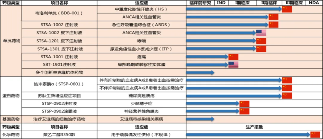 在老药收入下滑的阴霾下,舒泰神的创新药在研管线成为了市场的希望之光。根据2024年年报,公司共有15条研发管线,覆盖多个治疗领域,研发布局呈现多元化、差异化特点。在众多管线中,单抗药物韦洛利单抗(BDB - 001)、蛋白药物波米泰酶α(STSP - 0601)和苏肽生新增适应证项目(糖尿病足溃疡)进展较快,吸引了市场的重点关注。
