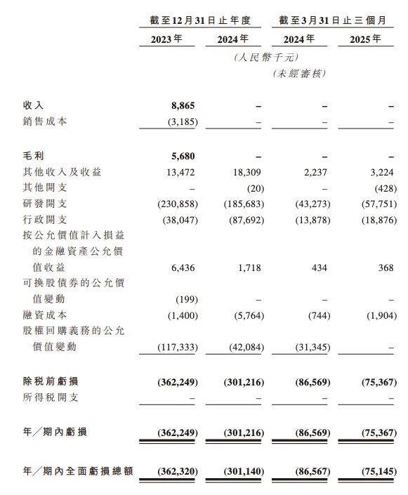 于2023年、2024年以及截至2024年及2025年3月31日止三个月,亏损净额分别为人民币362.2百万元、人民币301.2百万元、人民币86.6百万元及人民币75.4百万元。
