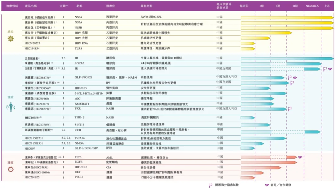 主要候选创新药包括1项治疗糖尿病的1类候选创新药奥洛格列淨,该药已向国家药监局(NMPA)递交新药上市申请(NDA);还有4项处于III期临床试验的1类候选创新药,即治疗乙型肝炎的东安帝(甲磺酸莫非赛定)、治疗IPF的东健帝(盐酸伊非尼酮)、治疗AML的东宁春(苯磺酸克立福替尼)及治疗食管鳞癌的东宁冠(甲磺酸莱洛替尼)。