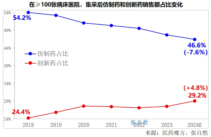 在≥100张病床医院,在集采之初的2019年,仿制药销售额在医院药品总销售额的占比超过了一半,高达54.2%,到2024年底,这一占比已降到一半以下,只46.6%,仿制药占比下降了7.6个百分点。