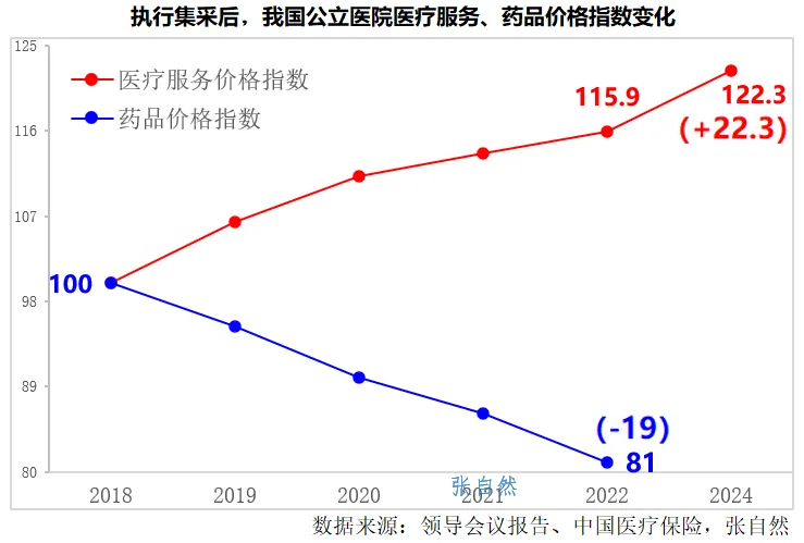 如将国采、国谈元年2018年的药品和医疗服务价格指数均定为100的话,到2022年,药品价格指数降为81,4年下降了19个百分点。医疗服务价格指数则上升到了2024年底的122.3,6年提高了22.3个分百分点,即仿制药降价弥补了医保服务价格提升的需求。(详见下图)