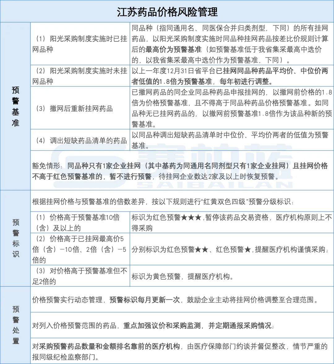 首先,在药价风险管理方面,多数省份普遍以1.8倍、3倍、5倍等作为药品黄标/红标价格的分界,江苏在此基础上结合其已推行5年的“红黄双色四级”预警分级标识,按药品高于预警基准程度分为“黄色”“红一星”“红二星”“红三星”,预警等级越高对应处置越严,“红三星”将被暂停交易资格。