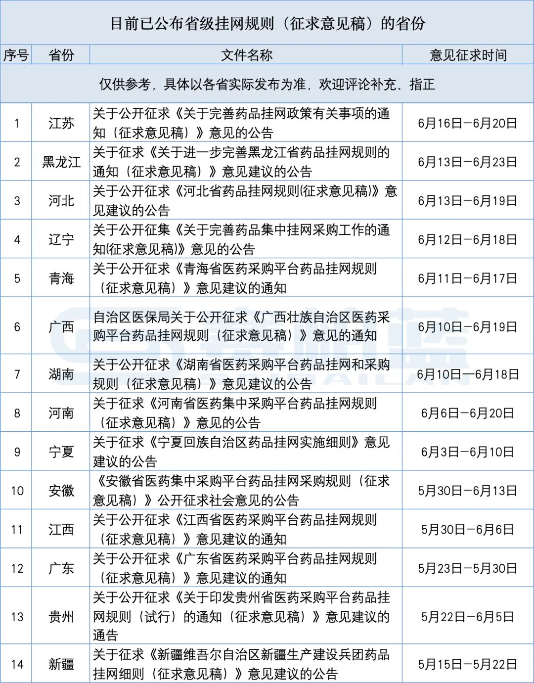 目前,多省已初步完成意见征集工作,全国药品挂网真正进入“一盘棋”阶段。