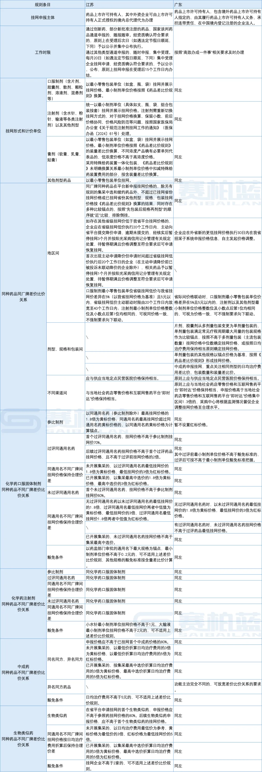 不过,江苏的文件中并未就医药集中采购机构内控管理等方面内容延伸,广东在此方面明确提出,受理挂网申报时,重点对老药新做、变换包装的价格变化保持敏感,涉及新申报挂网价格水平畸高、变化幅度巨大的,用好信息披露、公开问询等政策工具,排除价格风险。