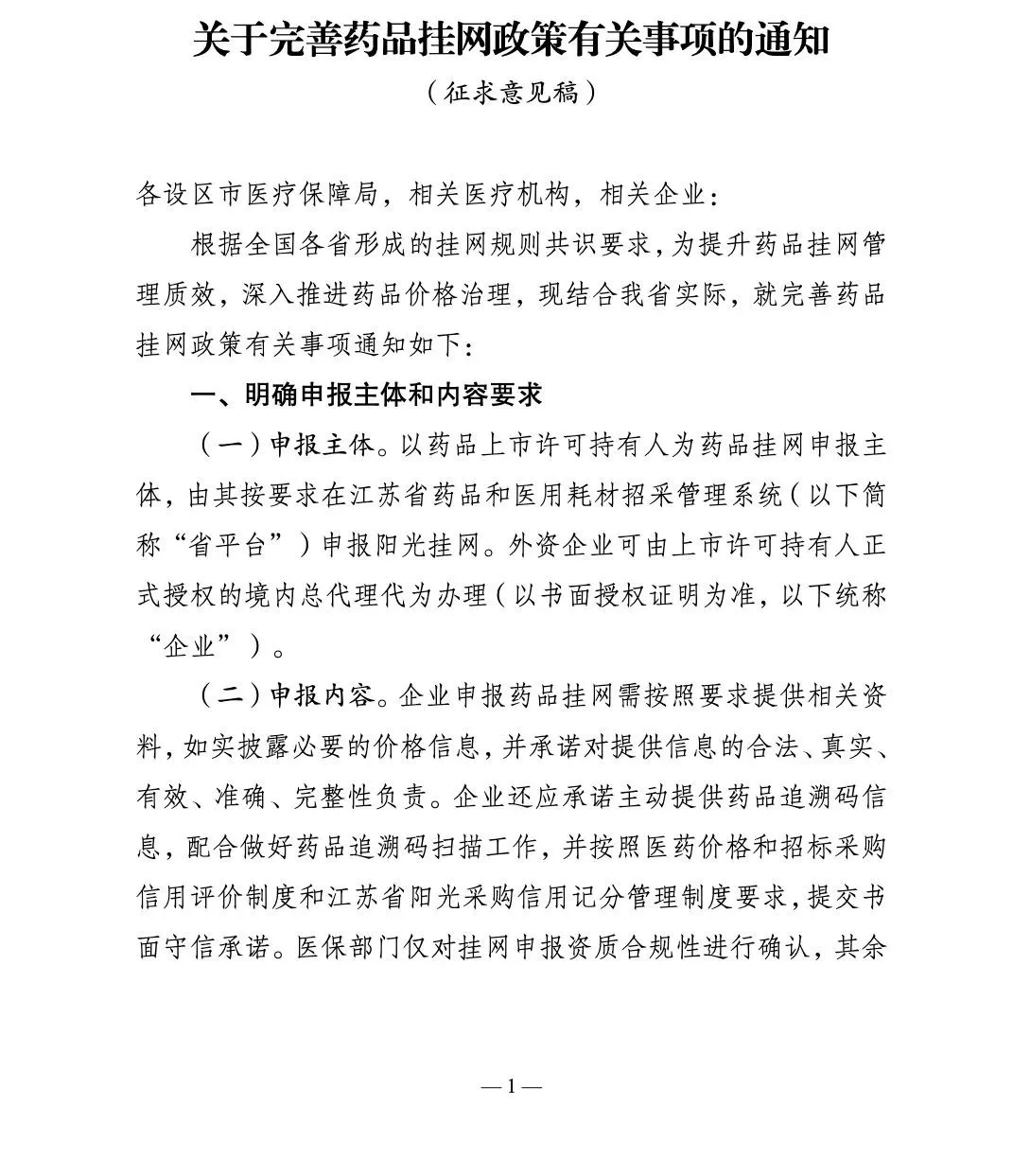 附2:江苏《关于完善药品挂网政策有关事项的通知(征求意见稿)》全文