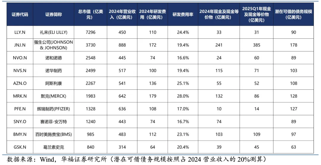 MNC均有迫切寻找重磅创新药的需求,而且全是膀大腰粗的金主,年度研发费用大部分超100亿美元,现金储备+可借债务基本上超100亿美元。