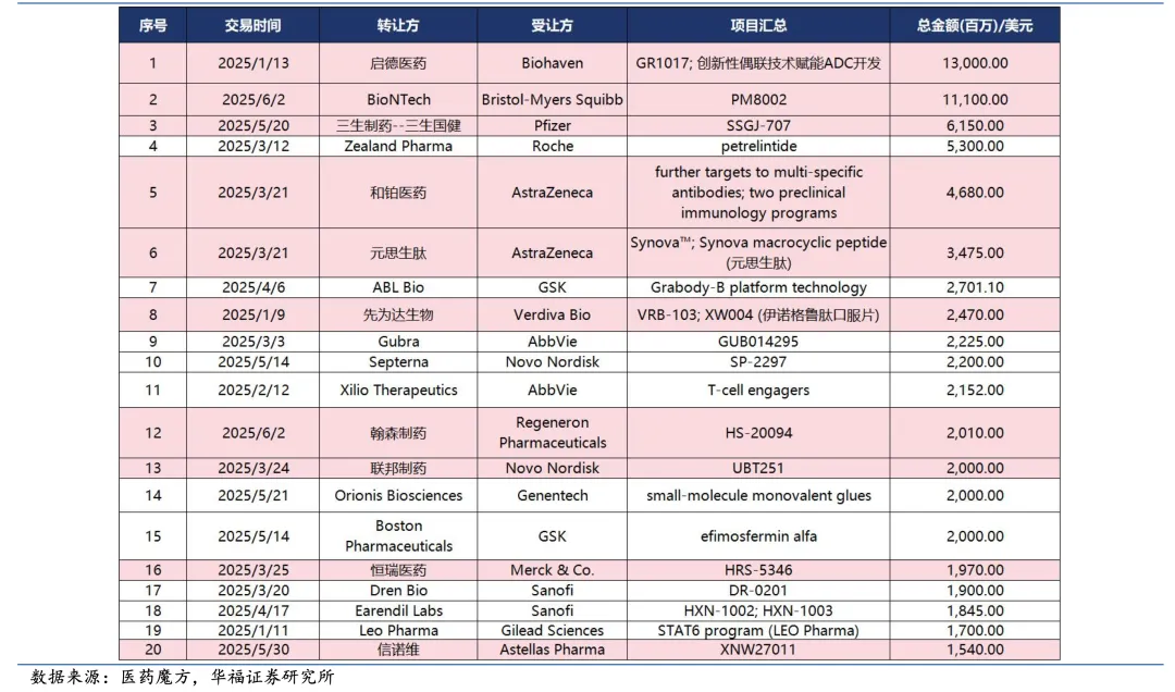 2025年成为中国创新药海外大单品爆发的元年,大量预期峰值过30-50亿美元的品种浮出水面,重磅交易持续不断,头部企业将长期受益于BD红利。